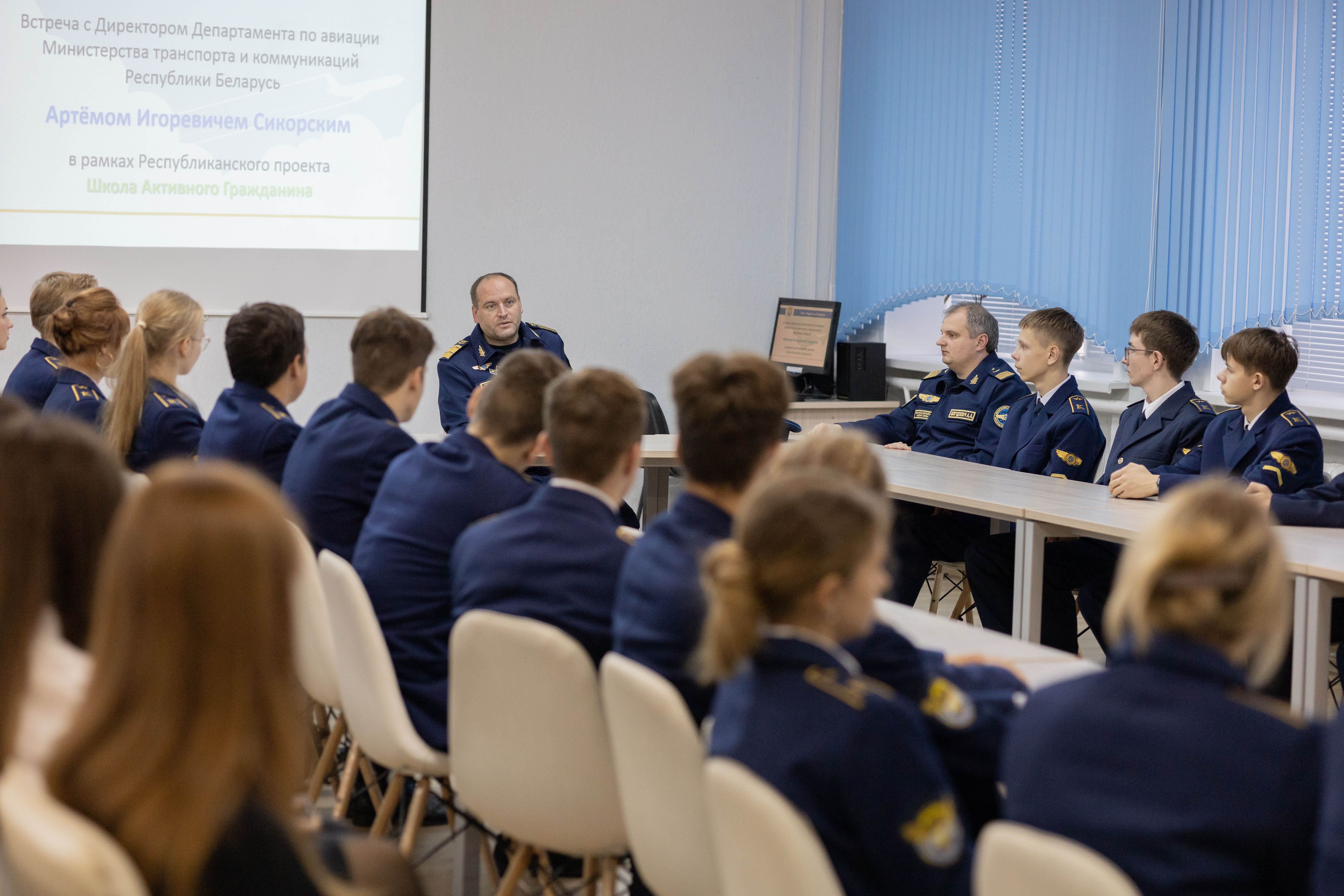 27 октября в Белорусской государственной академии авиации в рамках информационно-образовательного проекта «Школа Активного Гражданина» состоялась встреча директора Департамента по авиации Артема Сикорского с курсантами отделения среднего специального образования академии.