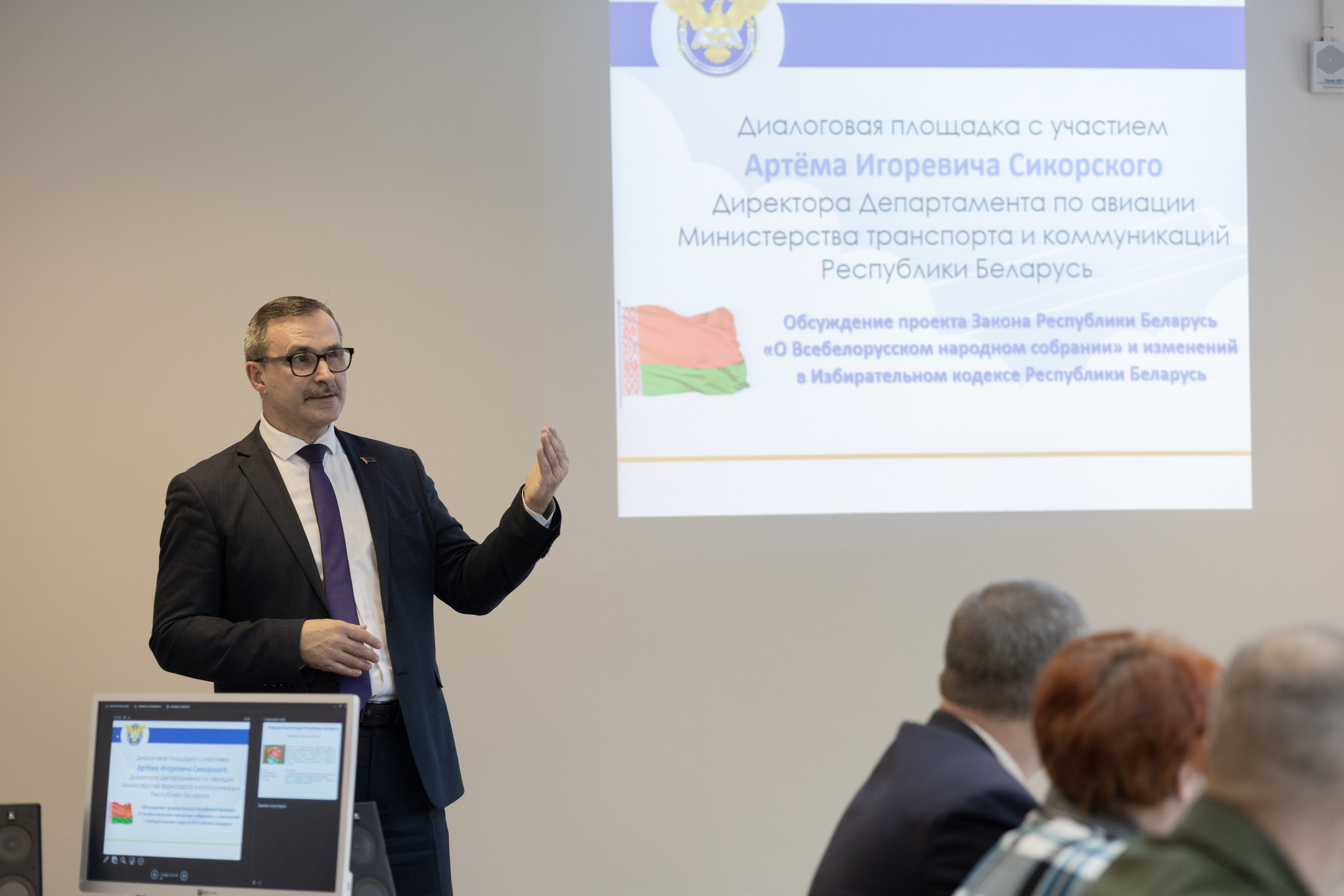 В рамках проходящего в нашей стране общественного обсуждения проекта Закона «О Всебелорусском народном собрании» (далее – ВНС) и изменений и дополнений в Избирательный кодекс Республики Беларусь, в академии авиации была организована диалоговая площадка, в которой приняли участие директор Департамента по авиации Артём Сикорский, ректор Артём Шегидевич и руководящий состав работников академии. В ходе обсуждения были рассмотрены компетенции и структура ВНС, статус делегатов ВНС и порядок их избрания.
