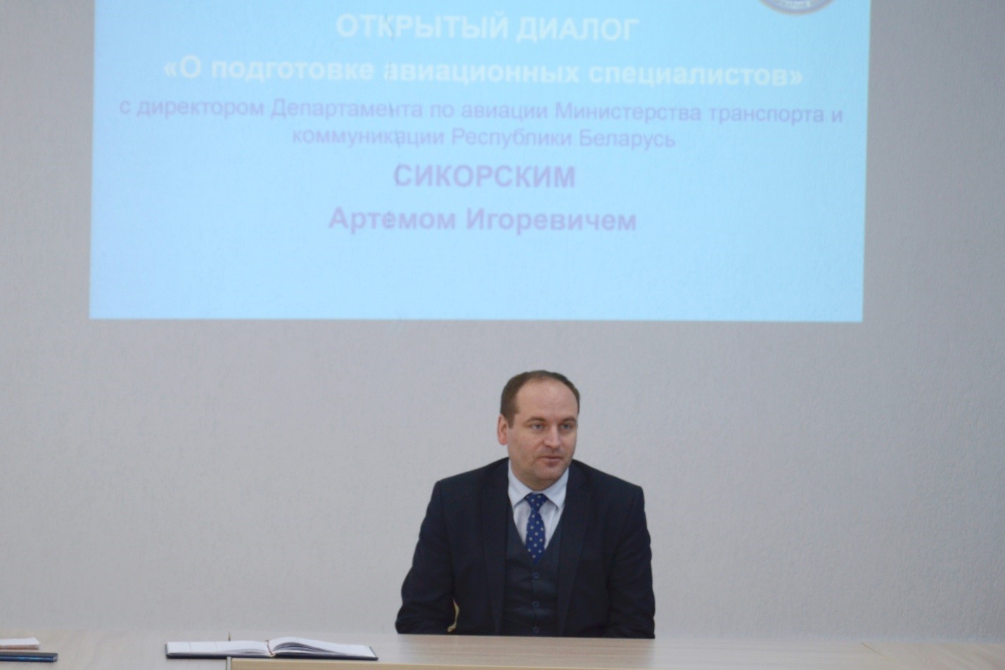 8 декабря 2020 в рамках единого дня информирования директор Департамента по авиации Артем Сикорский провел встречу с курсантами ГУ «Белорусская государственная академия авиации». Главной темой встречи стала «Подготовка авиационных специалистов».