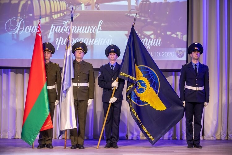Открылось мероприятие с торжественной части - выноса Государственного флага Республики Беларусь, флага Министерства транспорта и коммуникаций Республики Беларусь и флага Департамента по авиации, после чего курсанты зачитали приказ Министерства транспорта и коммуникаций Республики Беларусь «Об учреждении официальных геральдических символов Департамента по авиации».